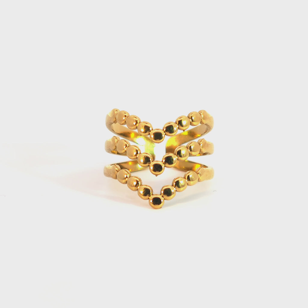Ottieni l'effetto stacked di più anelli in un unico, raffinato gioiello. Questo anello a fascia multipla combina la pulizia delle linee moderne con una texture delicata, creata da una sequenza di piccole perline (o sfere) metalliche.
