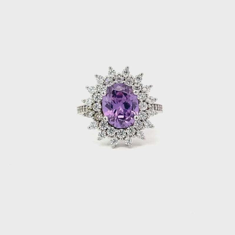 Anello in argento 925 con pietra centrale viola incorniciata da scintillanti zirconi bianchi. Un design raffinato per un look sofisticato.