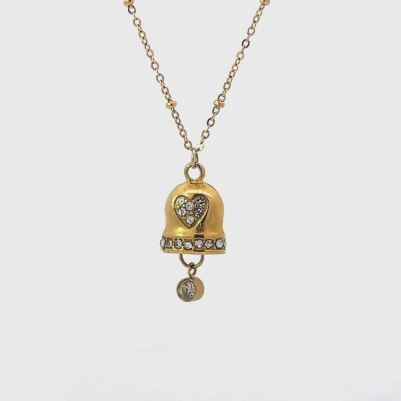 Collana in acciaio inossidabbile con ciondolo a forma di campanella decorata da zirconi. Un gioiello romantico e luminoso, perfetto da indossare ogni giorno.